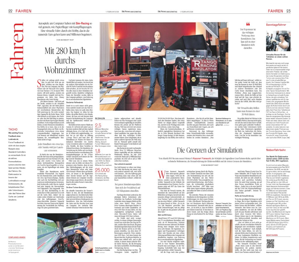 Norbert Rief, Leitender Redakteur bei “Die Presse”, publizierte in der Sonntagsauflage vom 1.2.2026 einen umfangreichen Artikel über Sim-Racing und Rennsimulatoren. Der Fokus lag auf der Entwicklung von Gran Turismo einerseits, und High-End Rennsimulatoren wie der Tango Racing Simulator, sowie Simulationen wie iRacing andererseits.