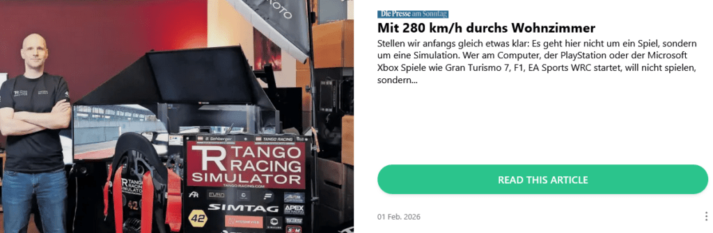Norbert Rief, Leitender Redakteur bei “Die Presse”, publizierte in der Sonntagsauflage vom 1.2.2026 einen umfangreichen Artikel über Sim-Racing und Rennsimulatoren. Der Fokus lag auf der Entwicklung von Gran Turismo einerseits, und High-End Rennsimulatoren wie der Tango Racing Simulator, sowie Simulationen wie iRacing andererseits.